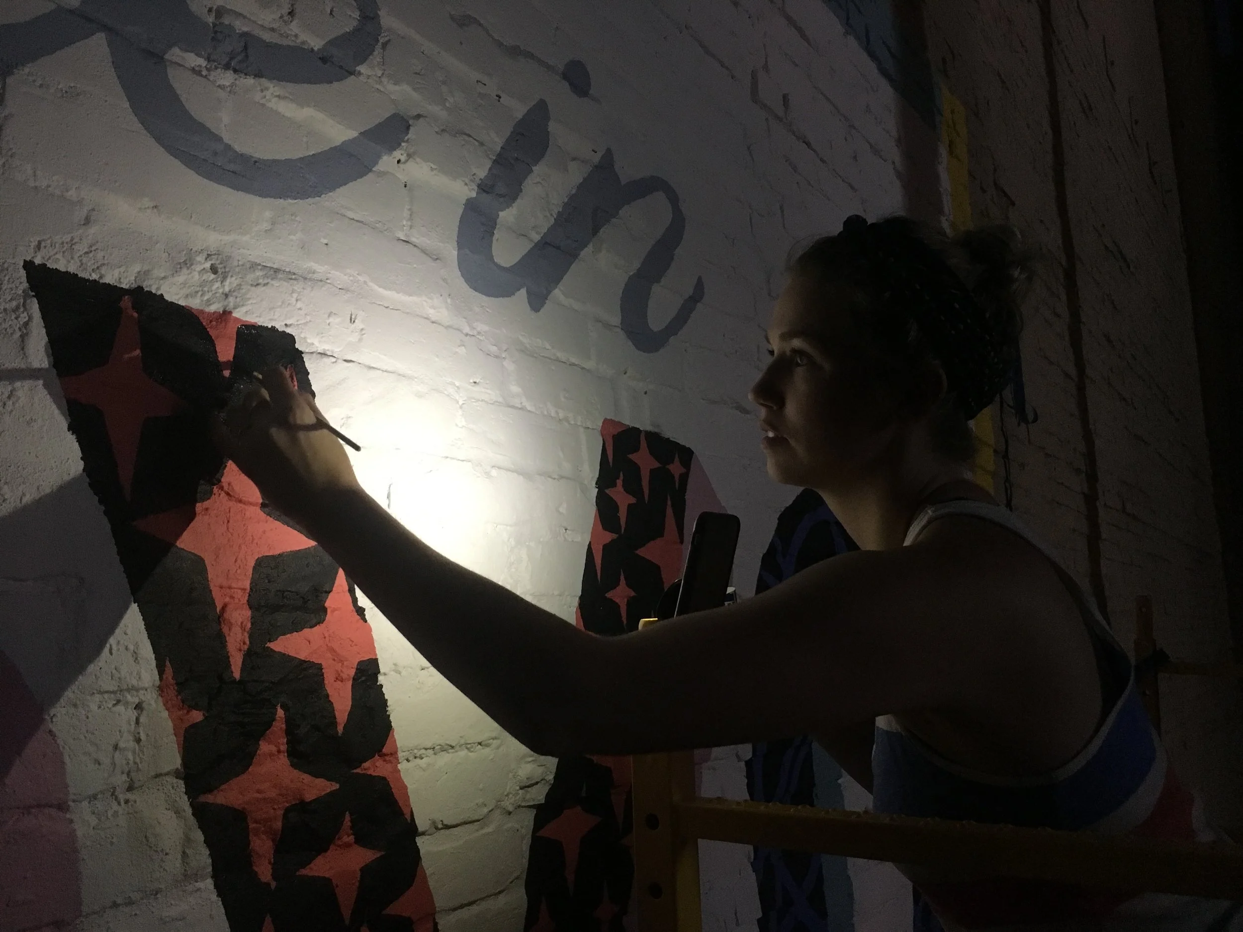 I enjoy art with impact and large scale installations. I aim to evoke playfulness through color, linework, wordplay, and interactive design.